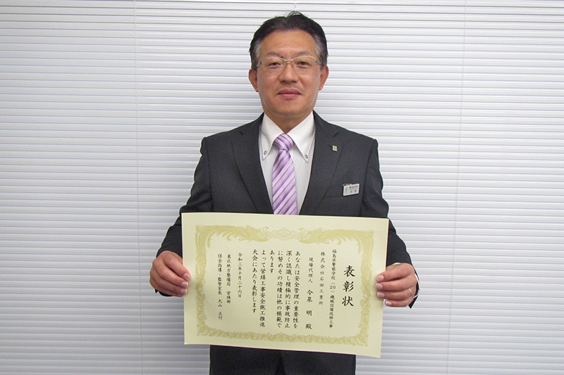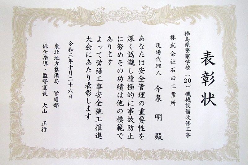 2021年10月26日 国土交通省東北地方整備局より表彰 「令和3年 優良企業保全指導・監督室長」表彰受賞 安全施工に貢献した企業ならびに現場代理人として表彰を受けました。 件名:福島県警察学校(20)機械設備改修工事 現場代理人:今泉 明(工事部社員) 新着情報一覧に戻る