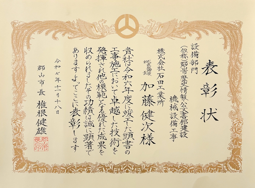 太平エンジニアリング・石田工業所特定建設工事共同企業体として施工した、「(仮称)郡山市歴史情報・公文書館建設機械設備工事」が、博物館運営に重要な空調設備の、温湿度自動制御装置の精密な調整への取り組みが評価され、「令和7年度 郡山市優良建設工事」として選定されました。