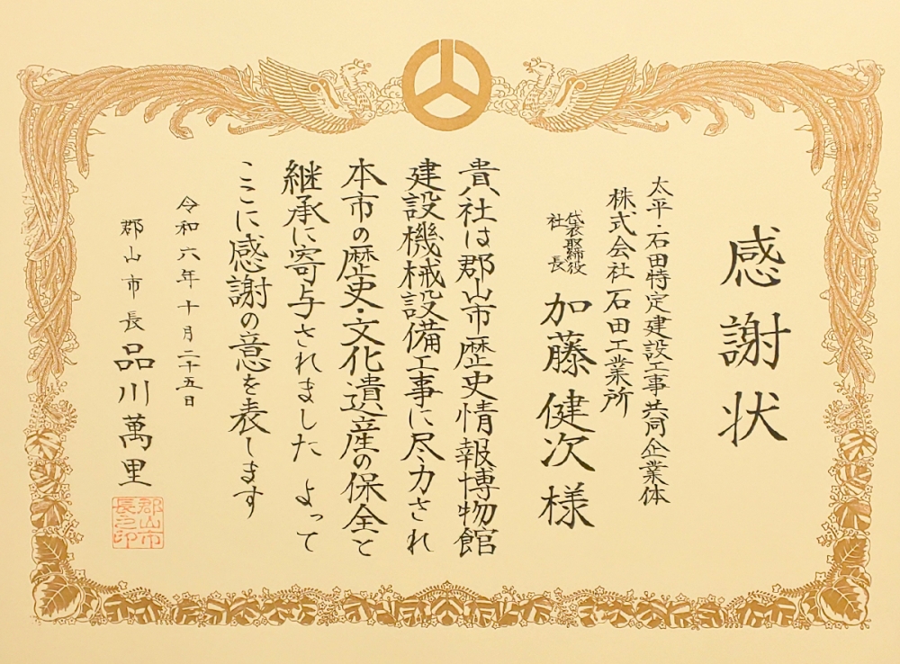 当社(太平・石田特定建設工事共同企業体)は機械設備工事を担い、郡山市の歴史・文化遺産の保全と継承に寄与すべく尽力しました。