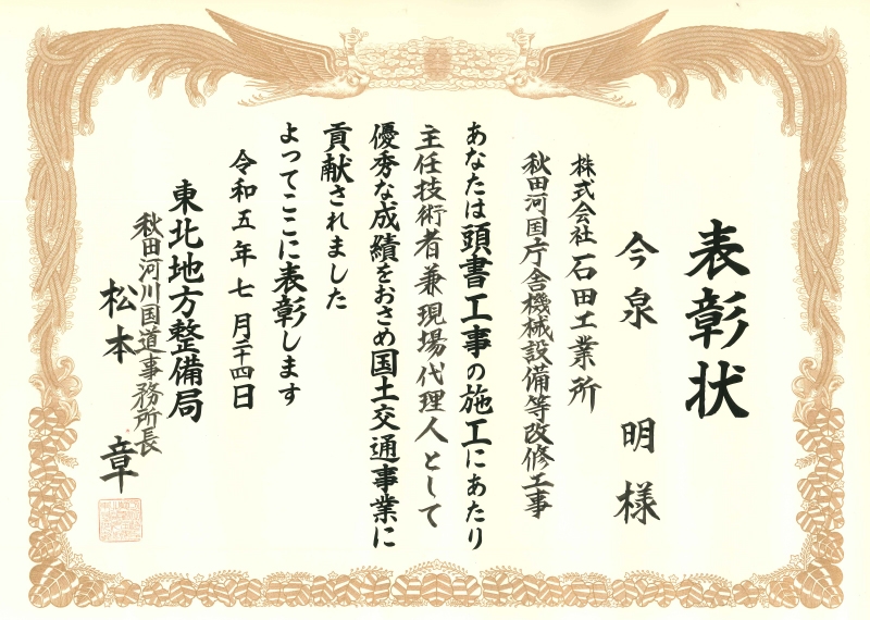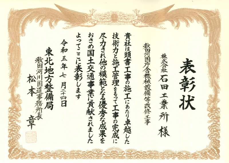 国土交通省東北地方整備局 秋田河川国道事務所より表彰