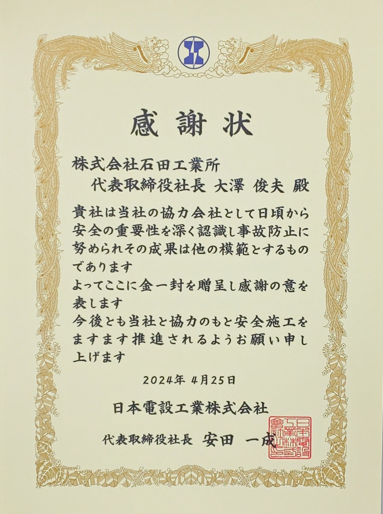 2024年4月25日 日本電設工業株式会社東北支店より、「施工安全協力感謝状」受領 2024年4月25日、第83期 安全推進大会において、協力会社としての施工協力に対し、感謝状を受領しました。 新着情報一覧に戻る