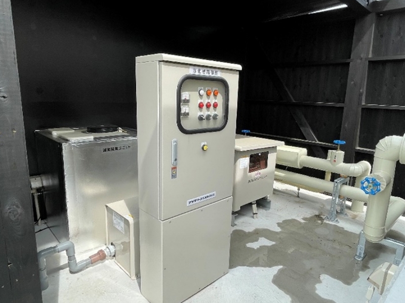 ・設計で受水槽下部に加圧給水ポンプおよび滅菌器を設置する計画でしたが、受水槽の高さを低くするため、元請業者へ木造のポンプ小屋設置を依頼しました。小屋下に機器等を収め、外壁は建物と景観を同一化させました。