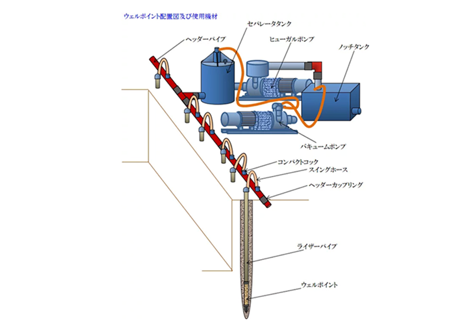 ウェルポイント工法を採用して、事前に吸水管を地中に打ち込み、地下水位を下げてから掘削する事で無事、浄化槽を設置することが出来ました。